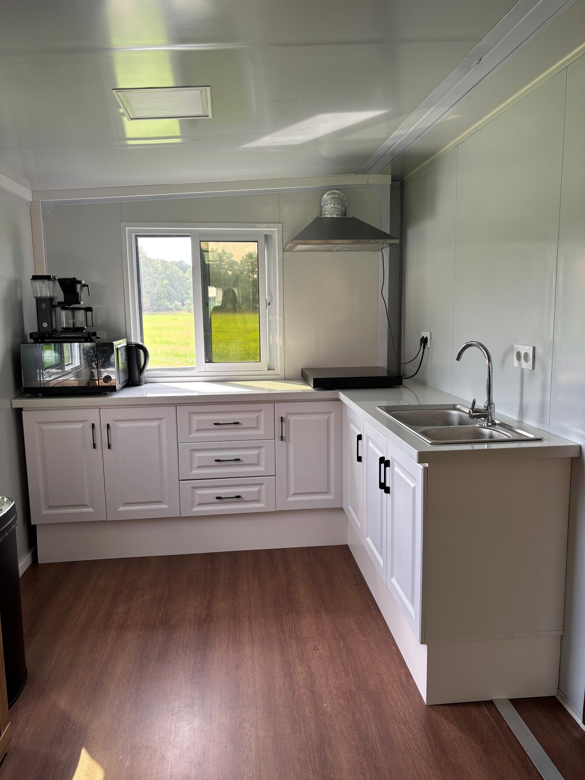 De keuken is standaard voorzien van een wastafel met waterkraan. Een elektrische kookplaat, afzuigkap, airconditioning en elektrische boiler zijn optioneel en worden niet standaard meegeleverd.